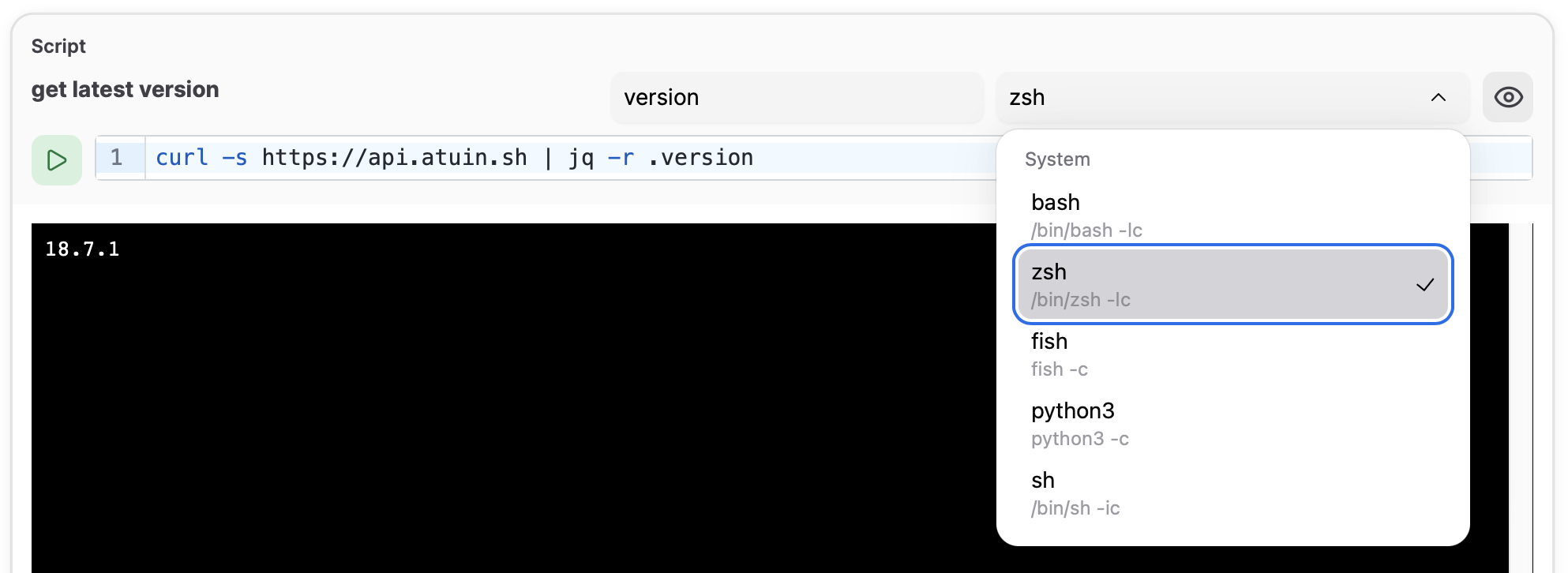 We support several different interpreters with the script block. While we default to zsh, we also support running code with the following: