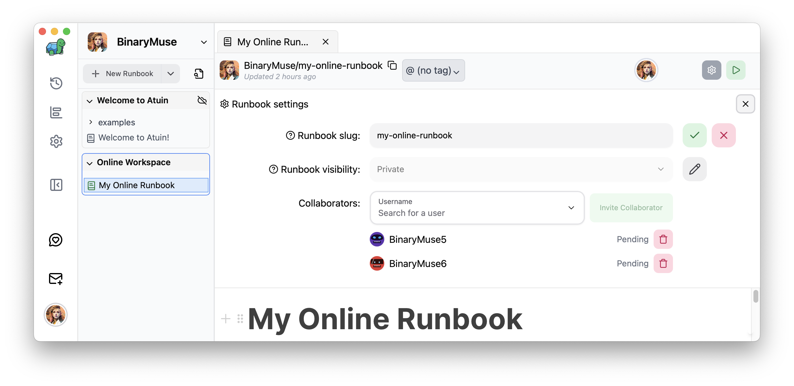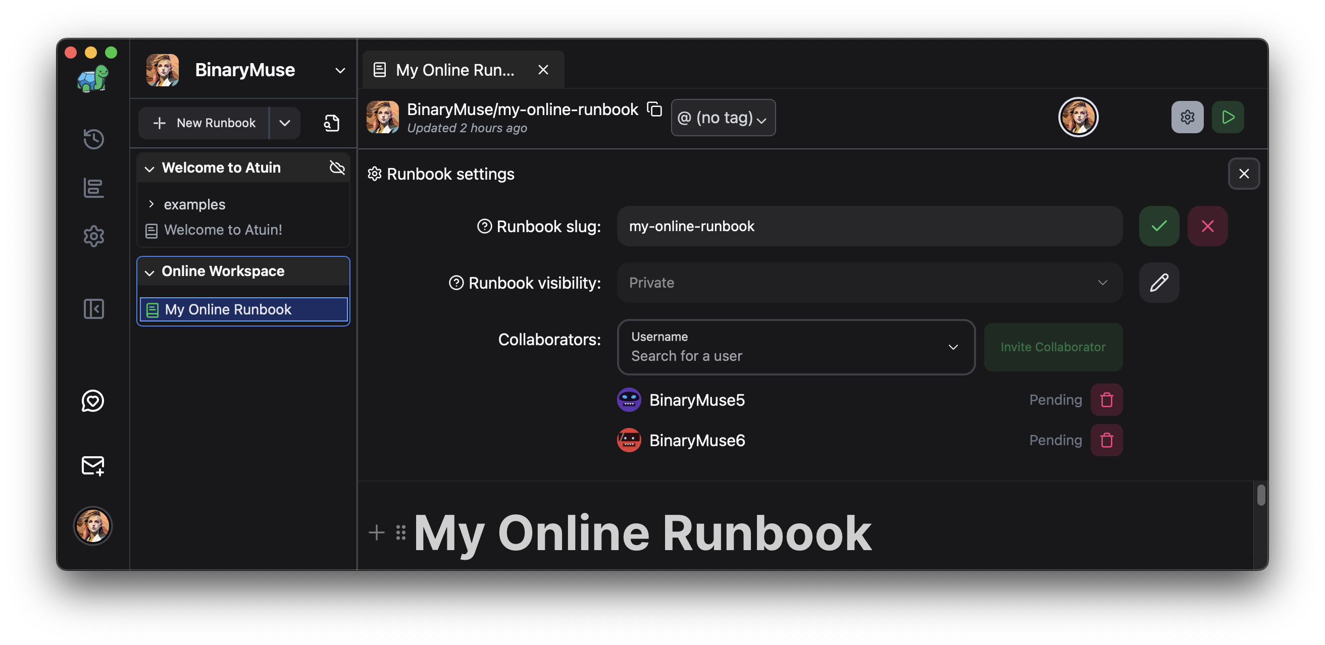 The Desktop app supports real-time collaborative editing. Once you've created a Runbook in an online workspace, you can collaborate on it via one of two methods.