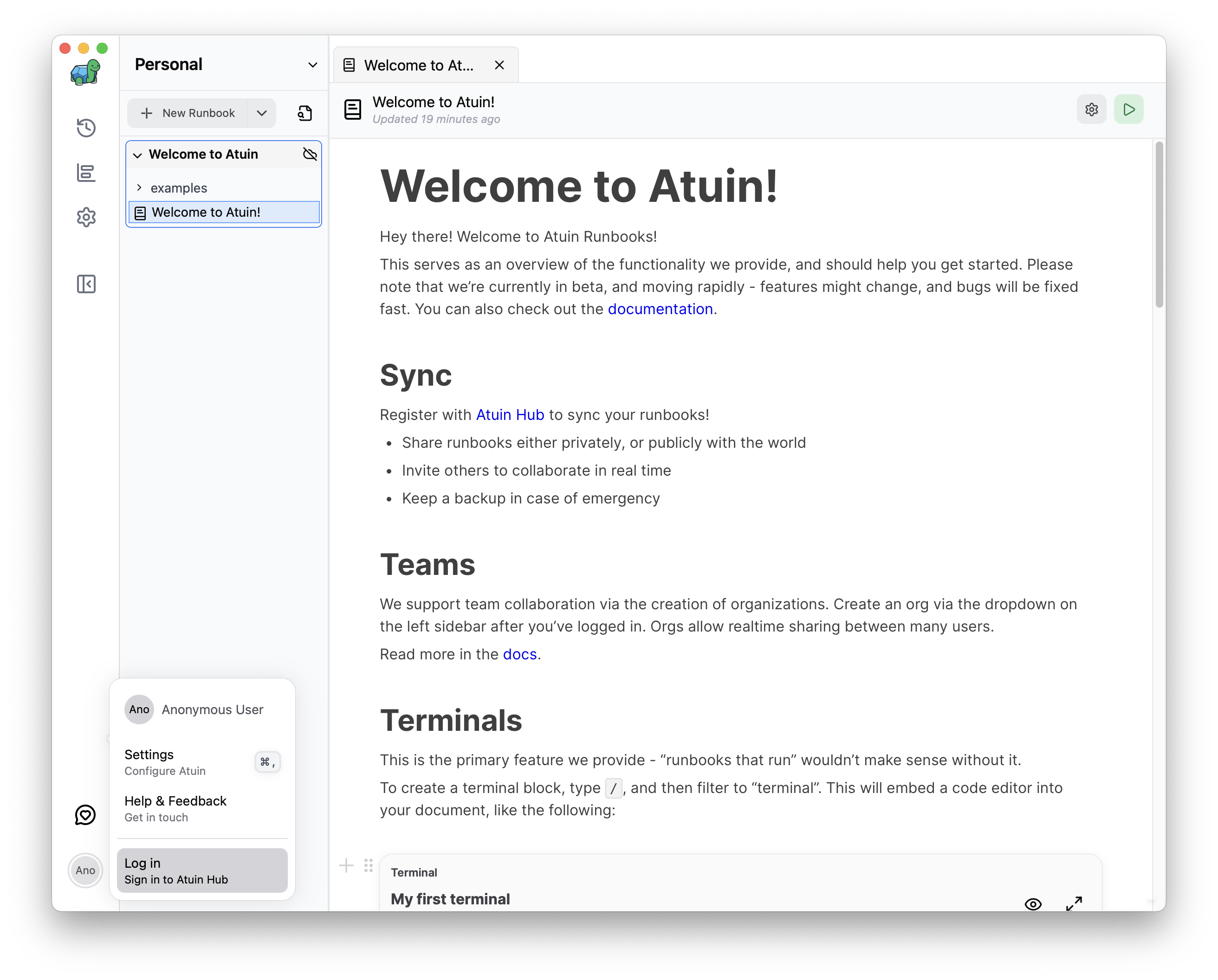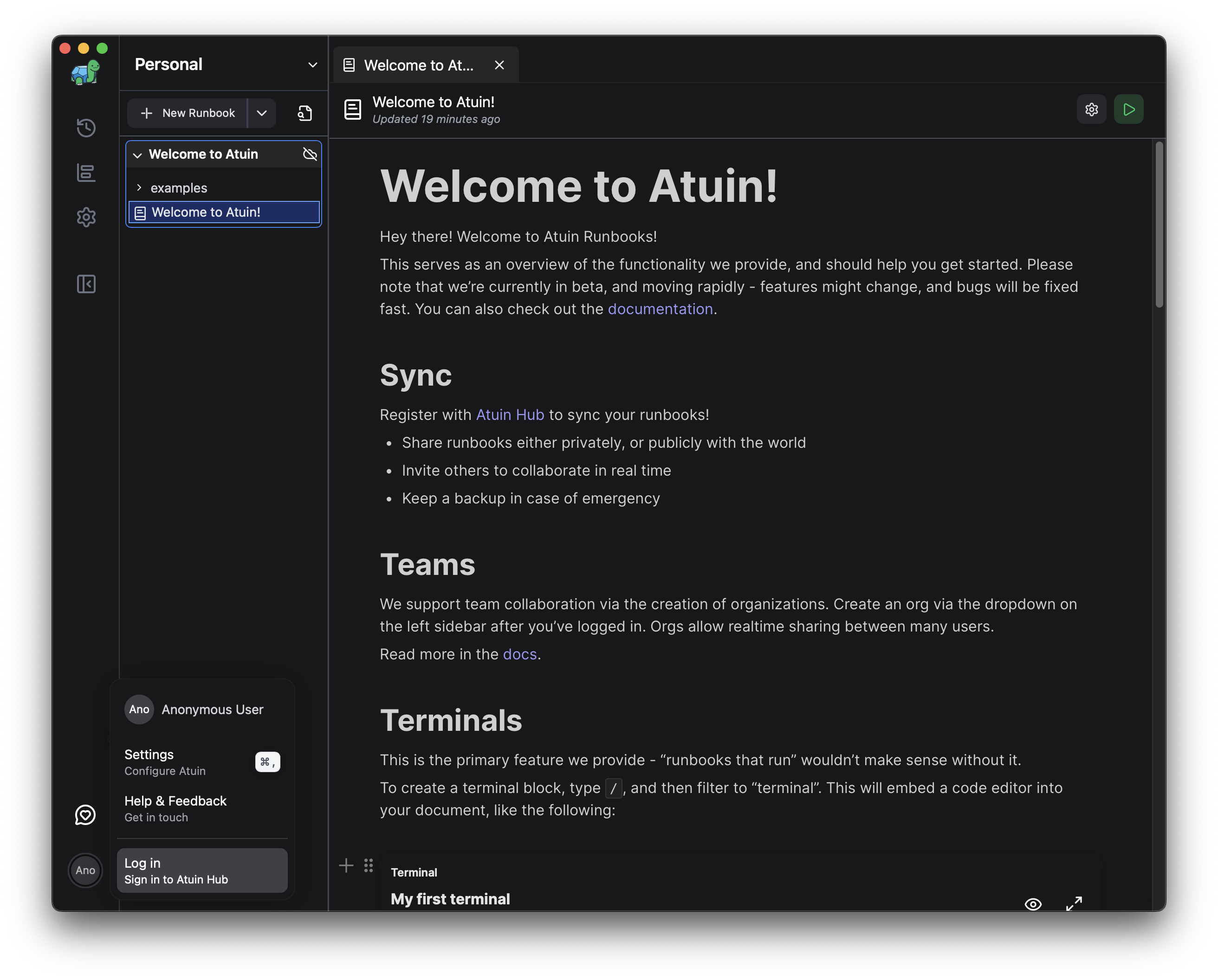 Atuin Hub (also referred to as "the Hub") is the a website for sharing and collaborating on Runbooks. To get started, register at https://hub.atuin.sh using a username and password, or one of our third-party auth providers.